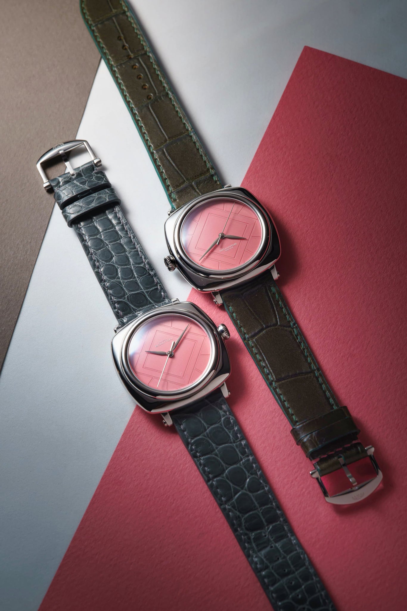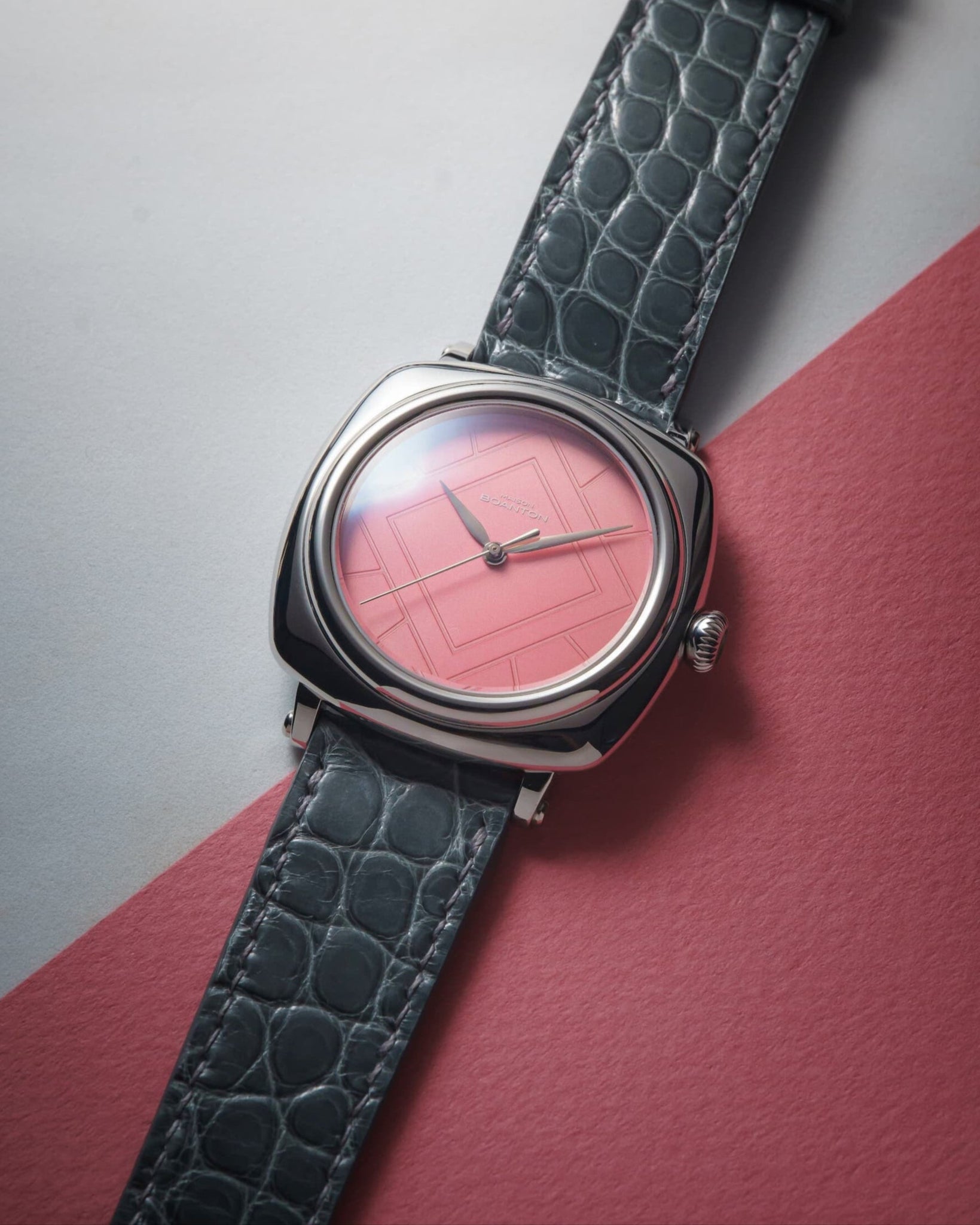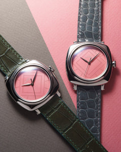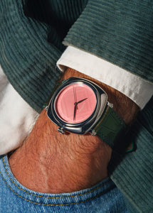 Avec son cadran en laque rose au design épuré et son boîtier coussin aux lignes rondes, la Maison Boanton signe une montre qui marie avec justesse l’élégance vintage à un style résolument contemporain. Ce rose subtil et équilibré attire l’œil, sans jamais compromettre l’élégance de la pièce.